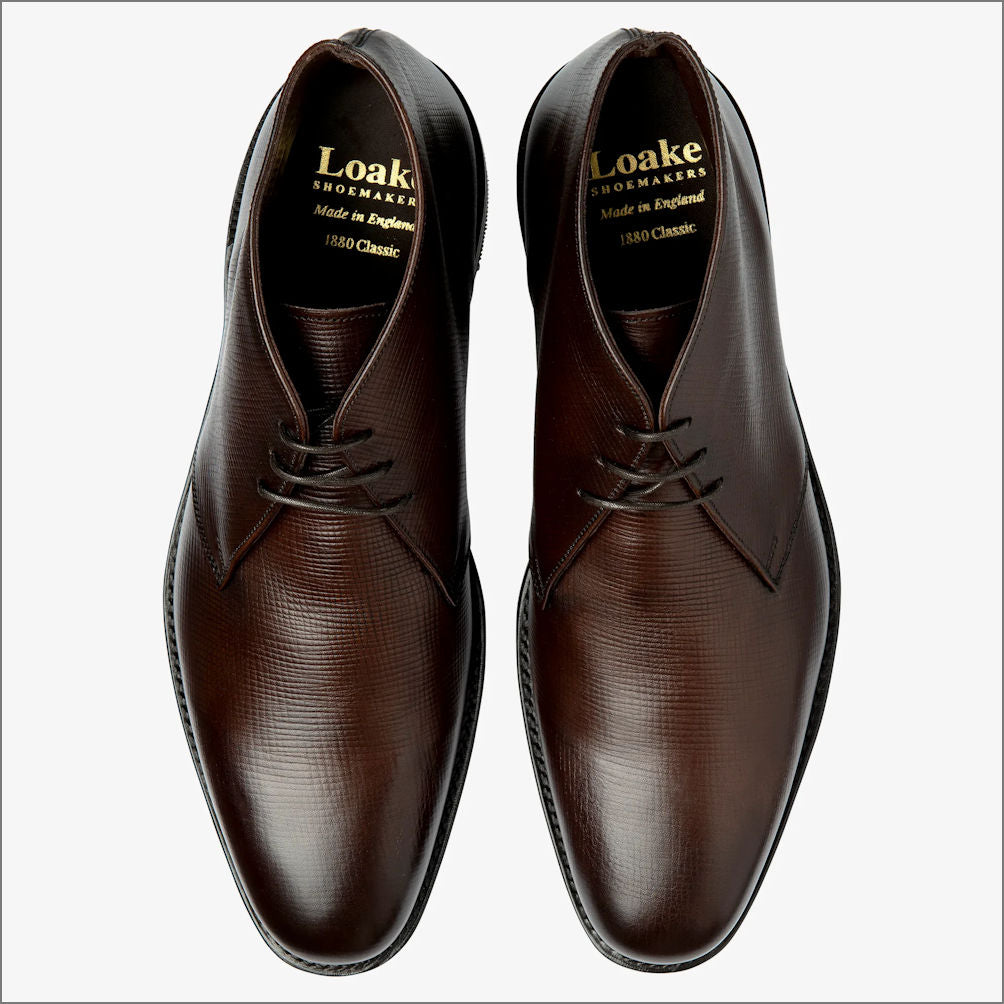 Pimlico is a premium dark brown grained leather Chukka Boot, combining refined British craftsmanship with everyday practicality. Built on the Capital last and offered in an F fitting, it provides a comfortable shape with a versatile silhouette that pairs effortlessly with both smart and casual attire. Featuring Goodyear welted rubber studded soles, Pimlico delivers durability, dependable grip, and the option of resoling for long-lasting performance. These men’s shoes are designed and engineered in Kettering, Northamptonshire, and handmade in Loake's high-grade factory in England, reflecting Loake’s enduring heritage of traditional shoemaking and timeless style.