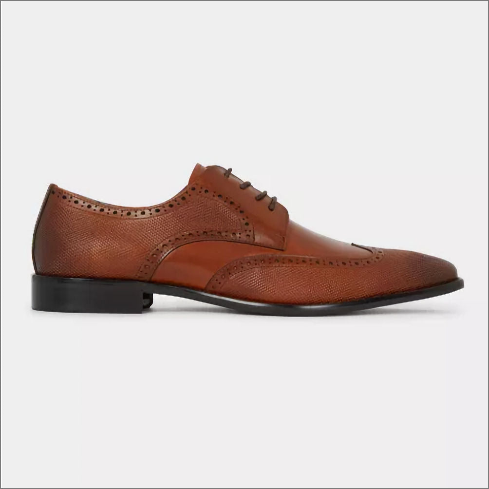 Burnt Orange leather brogue with embossed detail on heel and toe, open lace fastening, leather sock and lining and synthetic sole.