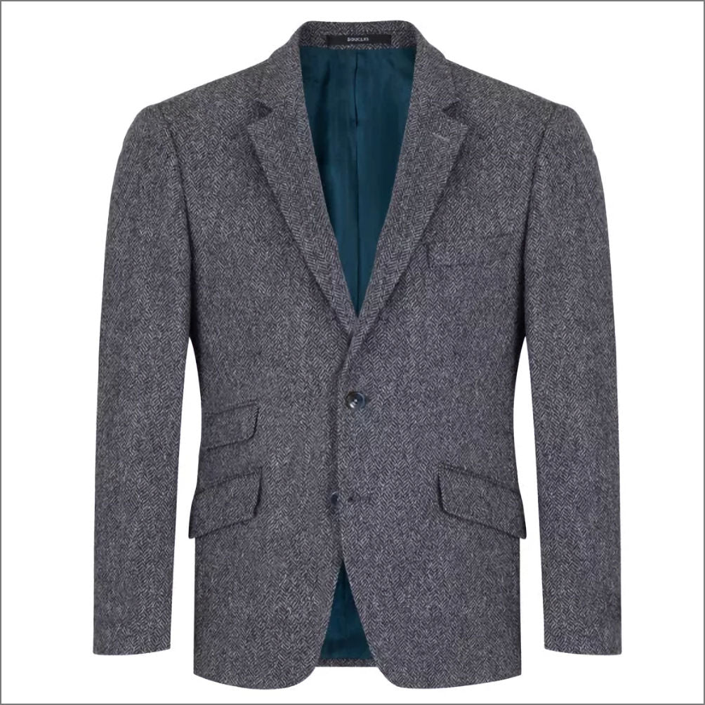 Blue regular fit pure wool jacket with herringbone design single breasted, button two side vents, slant flap side pockets. Ticket Pocket. Exclusive Moon Wool Fabric,
