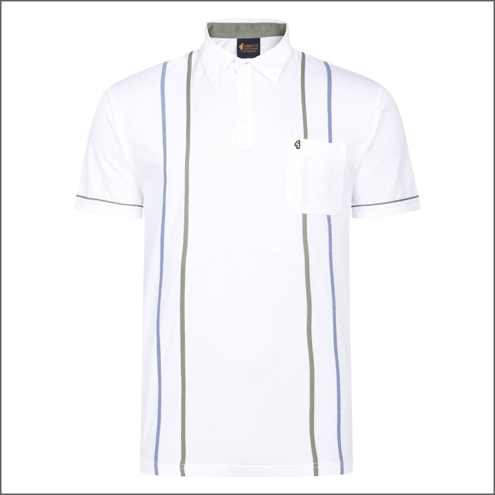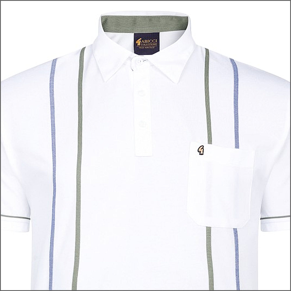 A classic half sleeve jersey shirt from Gabicci in a White body with a Green & Blue stripe pattern.